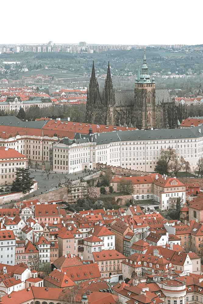 Stunning aerial view of Prague Castle, featuring the iconic spires of St. Vitus Cathedral dominating the city’s picturesque skyline. Explore the beauty and history of Prague, Czechia.