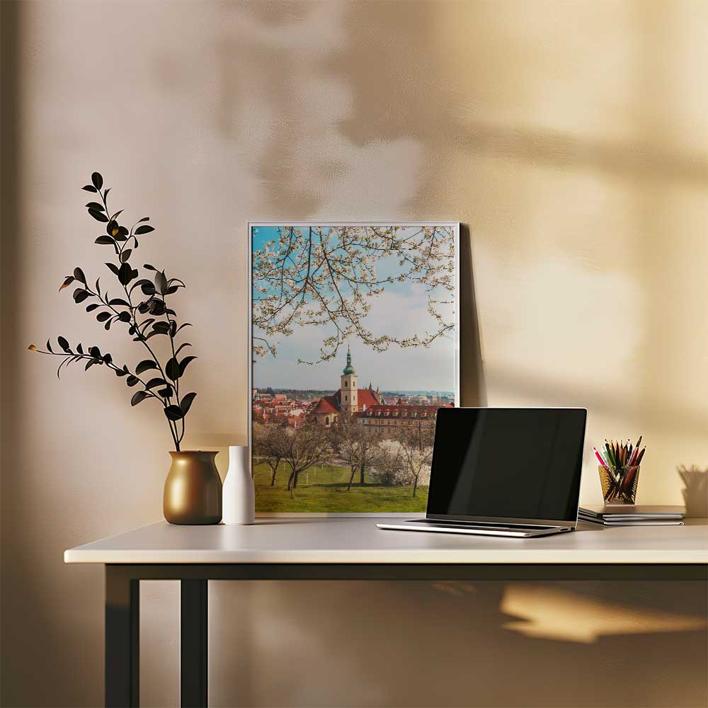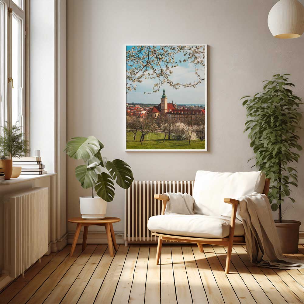 A photograph capturing the enchanting beauty of Prague during springtime, with the Petrin Tower as the focal point. The tower stands majestically amidst a vibrant display of spring blossoms, creating a picturesque scene. The photo is taken from a slightly elevated position, showcasing the architectural details of the buildings and the tower’s intricate design. It captures the essence of spring in Prague, with its vibrant colors and enchanting ambiance.