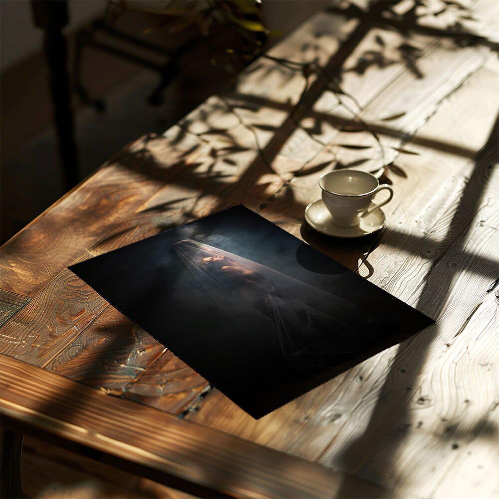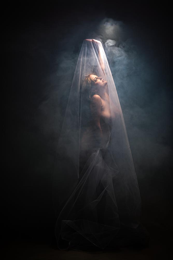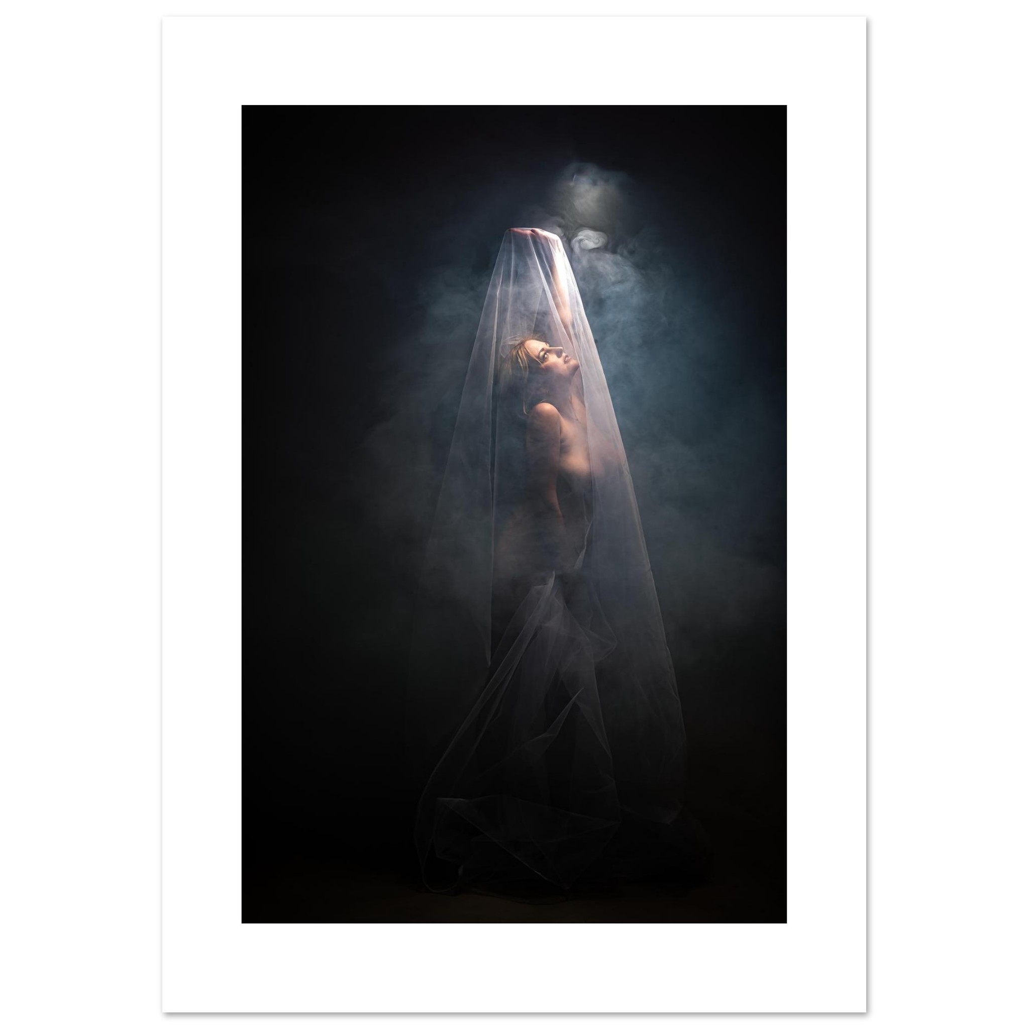 In the captivating photograph titled “Pure Of Grace ,” a woman stands enveloped in a sheer, translucent fabric. The delicate material drapes over their head and body, extending gracefully to the floor. Soft light from above bathes the figure, casting a serene glow. The mist or smoke surrounding them adds an otherworldly quality, blurring the boundary between reality and dream.